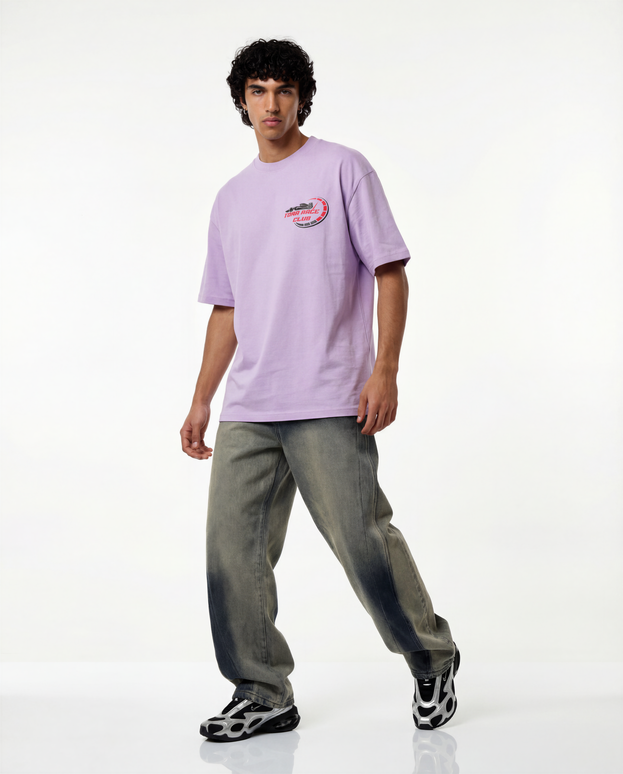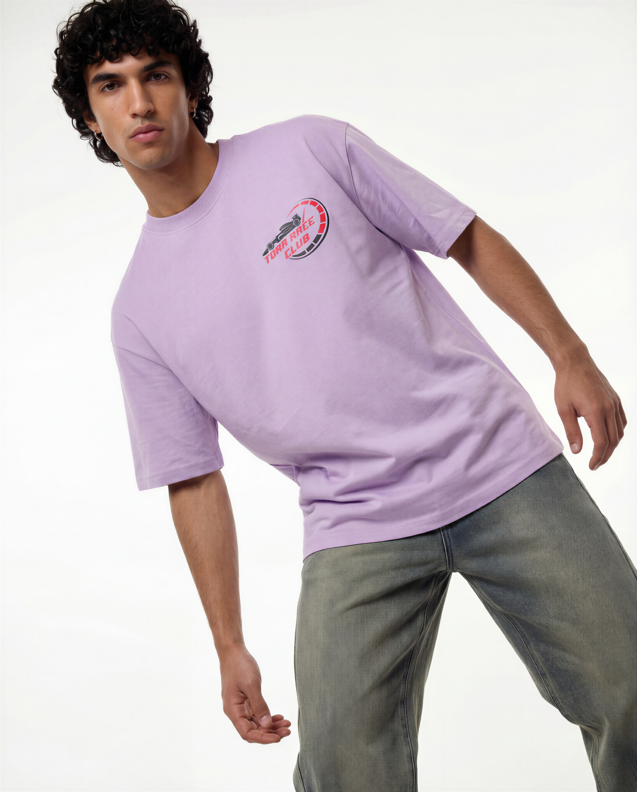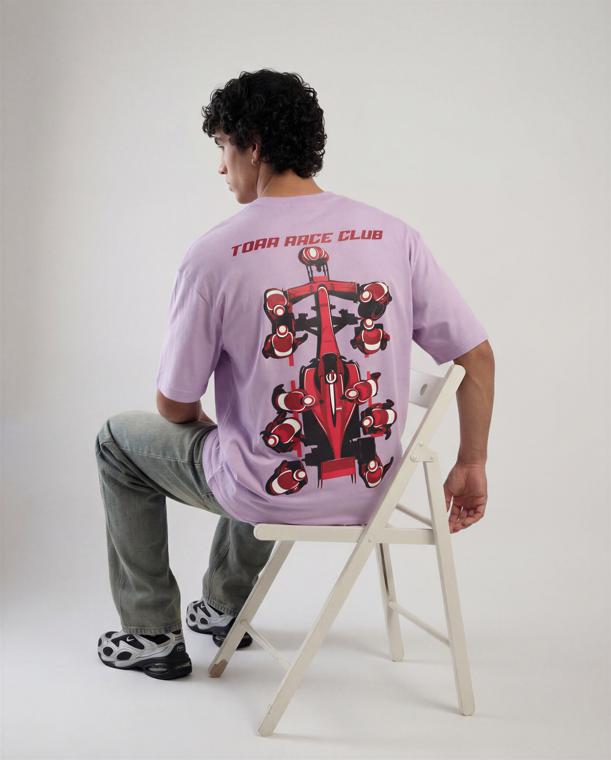 The front features a clean, minimalist “Torr Race Club” tachometer logo on the chest, while the back makes a bold statement with a high-impact, multi-layered graphic of an F1 pit crew in action. Rendered in striking red and black against a soft lavender backdrop, it’s the perfect balance of grit and pastel.Premium Build: Heavyweight cotton blend for a structured, high-quality feel.